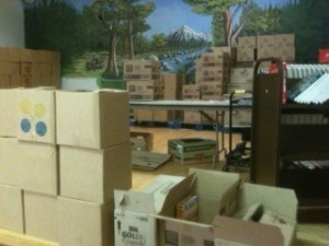The Salvation Army receives boxes of food and other necessities that are delivered to and collected by struggling residents.
