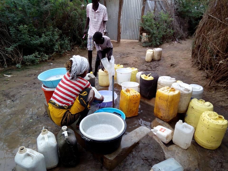 Refugees at Kakuma Camp fill containers with water to bring back to their tents.