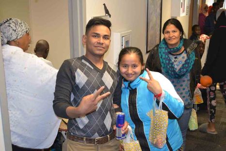 Refugees waiting in line to choose their costume.