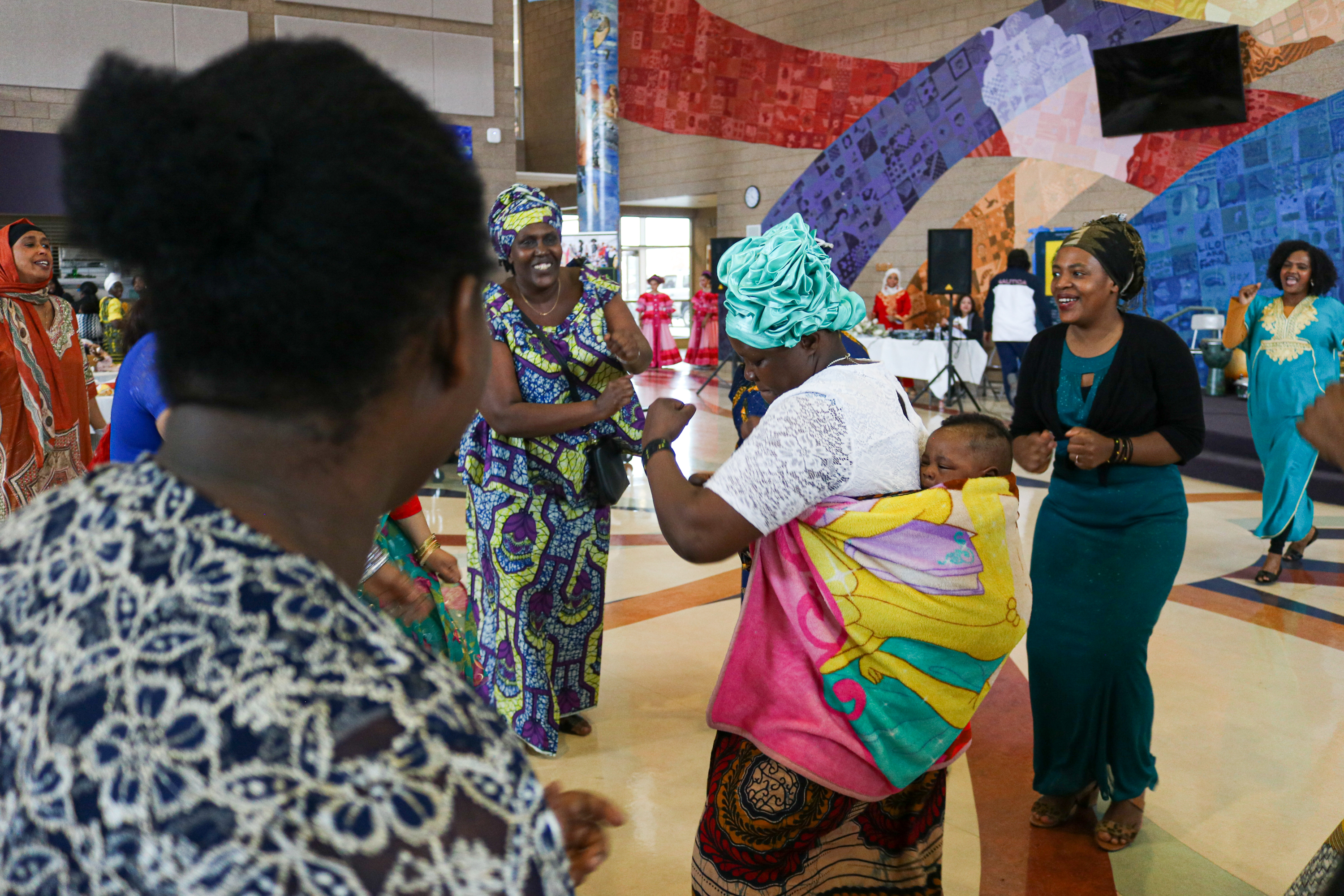Women cheer each other on while dancing in the middle of the Glendale cafeteria.