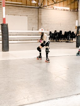 Hannah Rivas, also known by her derby name “Menstrual Psycho,” skating at practice.